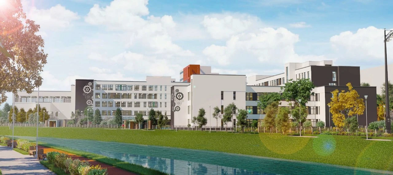 Площадь здания составит 30,2 тысячи квадратных метров. В школе разместятся инновационные учебные кабинеты, современные спортивные и актовый залы, лаборатории, библиотека и столовая.