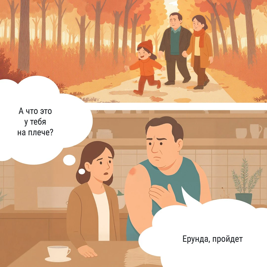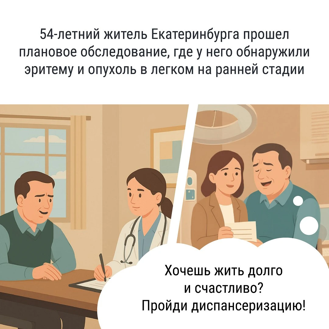 В карточках рассказываем реальную историю екатеринбуржца, который узнал о раке легких во время диспансеризации. Терапевт обратил внимание на эритему, ставшую предпосылкой онкологии. Это позволило провести лечение более эффективно и начать его на ранней стадии заболевания.