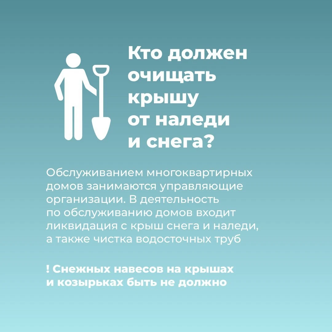 Напоминаем, что очистка кровель, козырьков и выступающих конструкций многоквартирных домов является прямой обязанностью управляющих организаций.