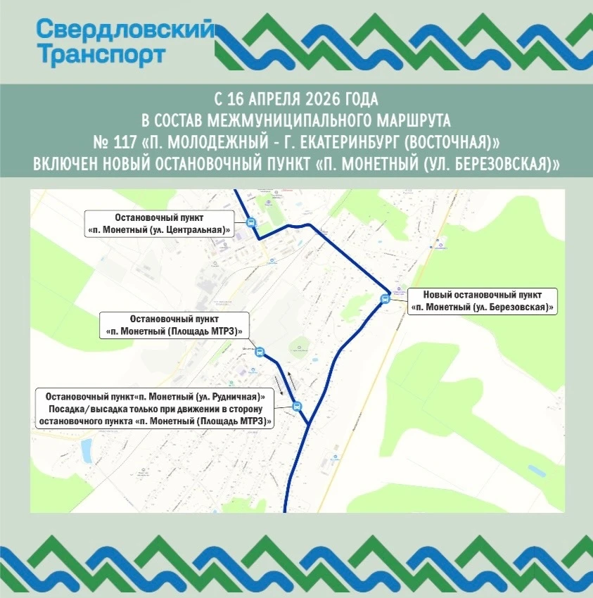 В состав маршрута № 117 «п. Молодежный – г. Екатеринбург (Восточная)» включён новый остановочный пункт «п. Монетный (ул. Березовская)». Теперь жители поселка Монетный смогут с комфортом отправляться в областной центр на этом востребованном направлении.
