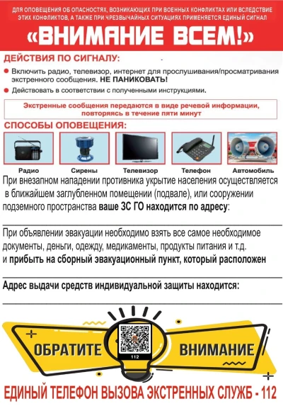 Дополнительная информация. При внезапном нападении противника укрытие населения осуществляется в ближайшем заглубленном помещении (подвале) или сооружении подземного пространства. При объявлении эвакуации необходимо взять все самое необходимое (документы, деньги, одежду, медикаменты, продукты питания и т.д.) и прибыть на сборный эвакуационный пункт.