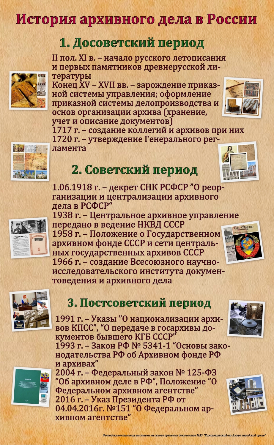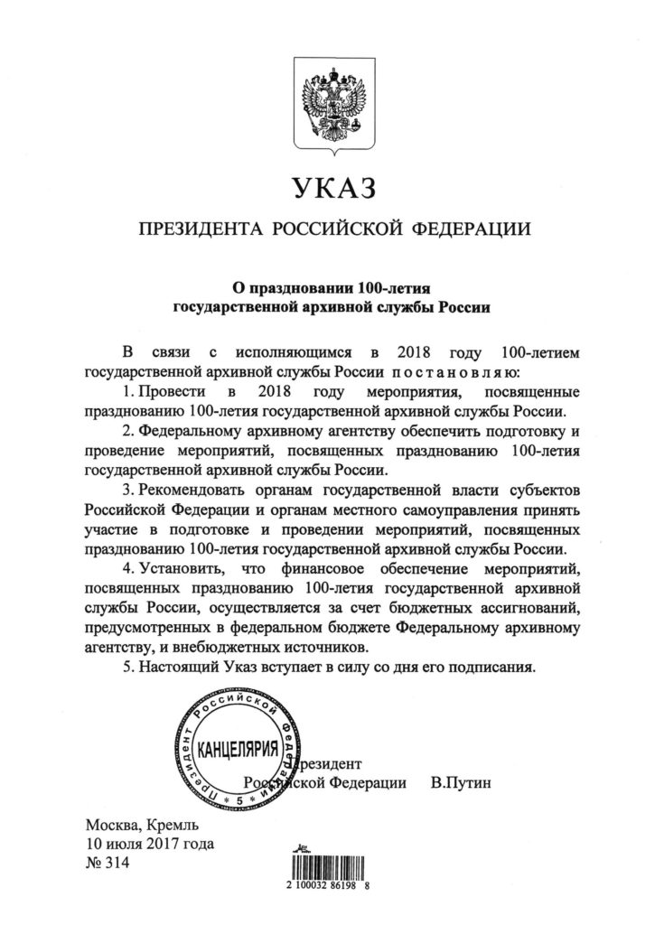 Распоряжение администрации Березовского ГО по 100-летию государственной архивной службы России (pdf, 1.45 MB) Указ Президента РФ о праздновании 100-летия государственной архивной службы России (jpg, 101.68 KB) Распоряжение Губернатора Свердловской области опраздновании 100-летия (pdf, 285.27 KB) Приказ Федерального архивного агентства (pdf, 212.67 KB) Краткая история архивного дела в России (jpg, 1.26 MB) ДЕКРЕТ о реорганизации архивной службы (jpg, 233.9 KB) РУКОВОДИТЕЛИ государственной архивной службы России (docx, 525.32 KB)
