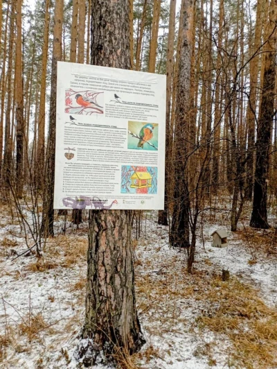 Информация на аншлаге посвящена организации зимнего подкорма птиц (чем можно их подкармливать, а что вредно, как построить кормушку и прочее). А установлен аншлаг на время зимнего сезона безопасным для дерева способом (с помощью тросика в мягкой оплетке).