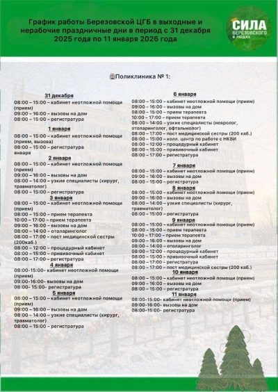 Берёзовская центральная городская больница информирует вас о графике работы в новогодние праздники. Мы понимаем, как важна доступность медицинской помощи в этот период, и готовы обеспечить вам необходимое обслуживание.