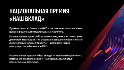 Российской Федерации и является публичным механизмом признания вклада бизнеса и некоммерческих организаций в реализацию национальных проектов.